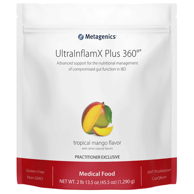 UltraInflamXPlus 360°® is a medical food formulated to provide strategic macro- and micronutrient support for patients with compromised gut function resulting from inflammatory bowel disease, including ulcerative colitis and Crohn’s disease. Provided in a proprietary, vegan pea/rice protein base, this formula addresses increased nutrient needs and potential deficiencies in these patients. This formula features CurQfen®, a clinically studied, patented curcumin blend designed for greater bioavailability and more reliable clinical outcomes. It has been demonstrated to result in up to 45.5 times more free curcuminoids in human plasma compared to standard curcumin extract. UltraInflamX Plus 360° also features XNT ProMatrix®– a proprietary protein matrix technology designed to enhance the delivery of a high quality xanthohumol compound for increased bioavailability and stability.