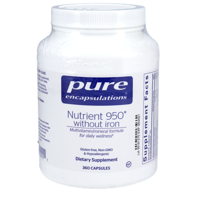 Nutrient 950 without Iron is a hypoallergenic multivitamin and mineral dietary supplement formulated to provide optimal nutritional support. Nutrient 950 without Iron offers an advanced mineral delivery system to promote proper absorption of nutrients.*Provides nutrients and minerals to support a healthy lifestyle*A gentle formula that is well tolerated by sensitive individuals*Made with hypoallergenic, vegetarian ingredientsNutrient 950 is a complete hypoallergenic, high-nutrient, bioavailable multi-vitamin, multi-mineral and trace element supplement. It offers an advanced mineral delivery system, and the highly desirable coenzyme forms of B vitamins to promote optimal absorption of the nutrients. In addition, it provides a high profile of free radical scavenging antioxidants. This is a gentle, hypoallergenic formula which is well tolerated by sensitive individuals.